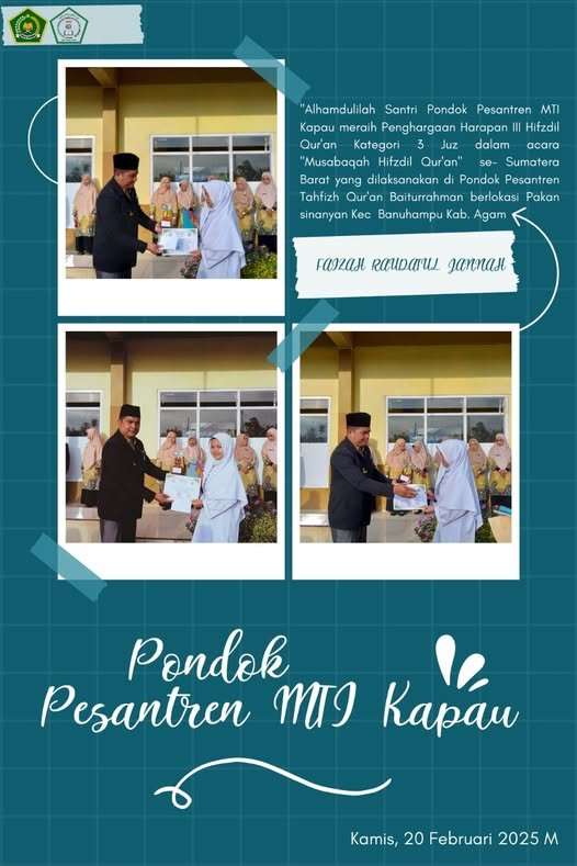 Alhamdulilah Santri Pondok Pesantren MTI Kapau meraih Penghargaan Harapan III Hifzdil Qur’an Kategori 3 Juz dalam acara “Musabaqah Hifzdil Qur’an” se- Sumatera Barat yang dilaksanakan di Pondok Pesantren Tahfizh Qur’an Baiturrahman berlokasi Pakan sinanyan Kec Banuhampu Kab. Agam
